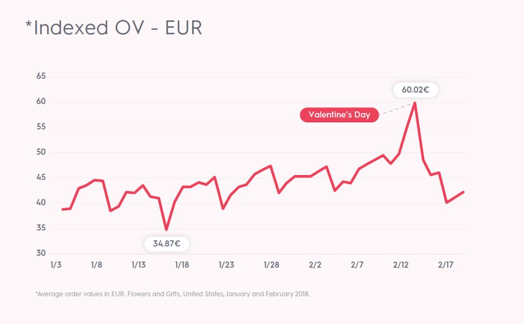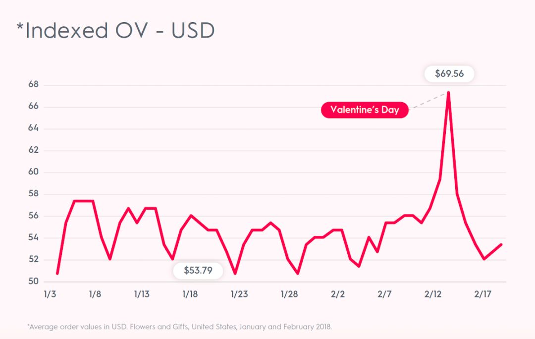 在美国,情人节平均订单价从1月份的平均55美元一路上升到70美元。在欧洲也一样,情人节平均订单价从1月份的平均42欧元一路上升至最后一刻的60欧元。