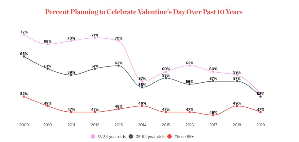 尽管现在粉红色的心形图案盛行,巧克力盒数不胜数,但2019年的情人节与十年前相比还是大不相同。十年前有超过60%的成年人计划庆祝情人节,但是现在过节的人越来越少了,但是情人节期间的消费热情却丝毫不减,据NRF预测,美国今年情人节的销售额将超过200亿美元。