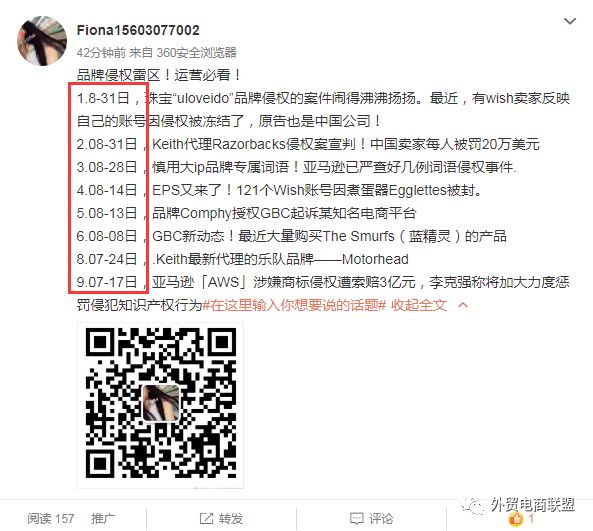 最新完整版的跨境电商旺季防侵权品牌预警案例请扫一扫联系小编获取即可!