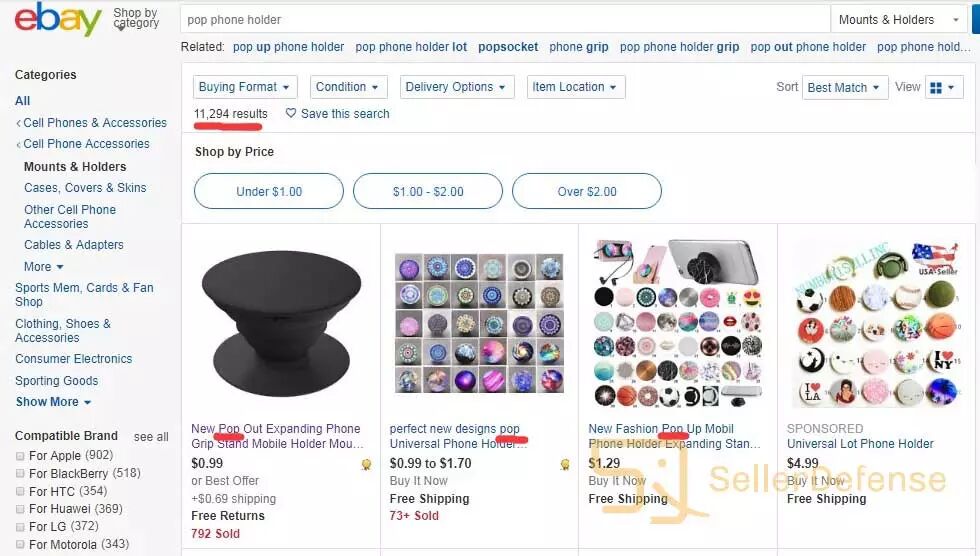 因为 POP 这个词绝大部分卖家不会认为它是一个商标,所以危害性非常大,帖子发出后,我们尽我们最大的努力提醒卖家抓紧修改产品标题,但是很遗憾的是目前仍然能在各平台上搜到大量使用了此关键词的产品,以下是ebay平台搜索 pop phone holder 的结果,显示有10000+搜索结果。