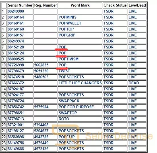 还有一个非常重要的信息是,PopScokets公司还在其他大类申请了POP商标,目前还是TM标,非R标(即商标注册还在进行中),这些也非常危险:(下图中Reg. Number列为空的即为TM商标)