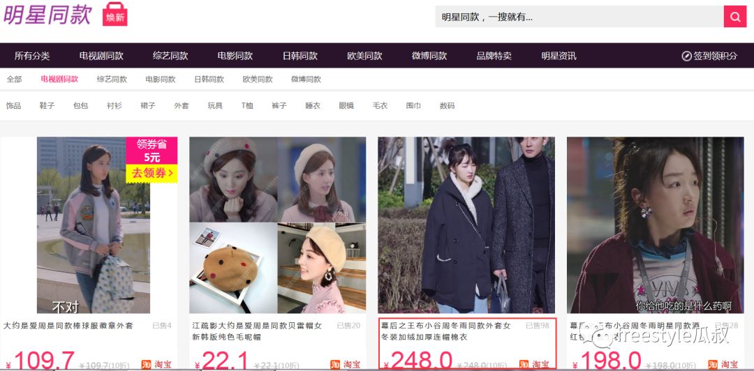 他们也懂得利用人们对影视明星IP的追逐心理,但不会只拘泥于某一个热点,而是把所有此类热点汇集在一起,做成一个系统性的同款网站。