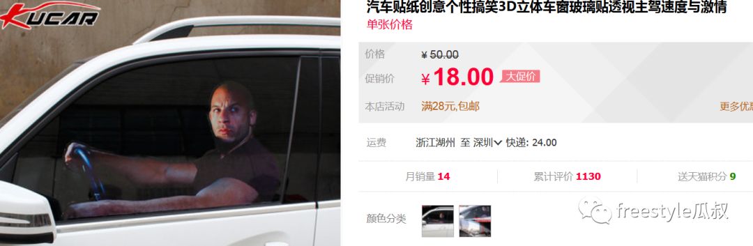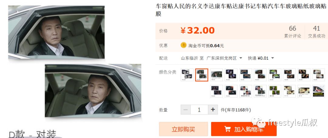 在追影视热点上,淘宝大神的脑洞我是服气的:《速度与激情》火了,有人出范·迪塞尔车窗贴;《人民的名义》火了,又有人出了达康书记车贴,居然还卖了上千单(吓得瓜叔都坐地上了)。