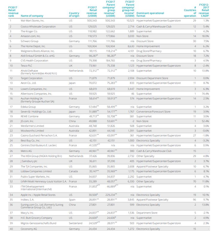 报告显示,沃尔玛位居第一,亚马逊继续上升至第四位。中国名次最高的是京东,升至第20位。