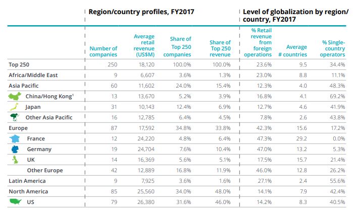 报告显示亚太地区顶级零售商的大部分收入来自本土,且国际业务方面的投资也相对放缓。德勤补充表示,这些亚太公司近一半只在本国经营,该地区前250强的60家零售商的综合收入中有88%来自国内。平均而言,它们仅在4.0个国家运营,而整个250强国家的地域覆盖率为9.5个国家。