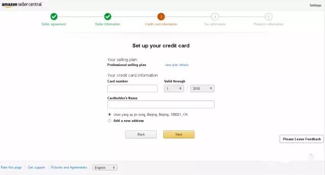 按照亚马逊的要求填写信用卡信息就可以了。 填写信用卡卡号、有效期、持卡人姓名、帐单地址,设置您的收款方式。
