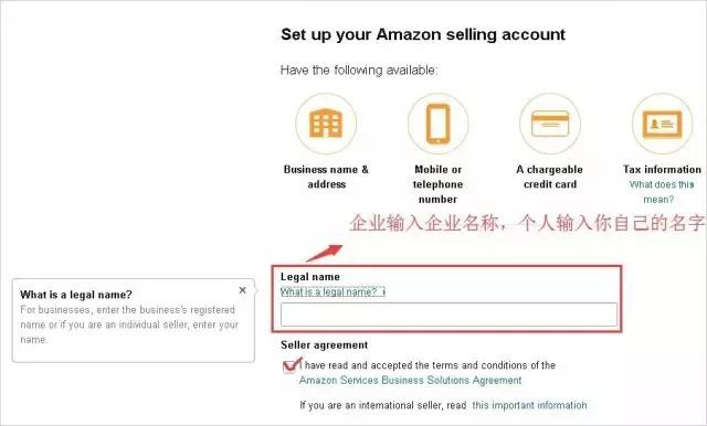 如果是企业就输入企业的名称,如果是个人的话就输入个人的名称,然后同意亚马逊的条款。