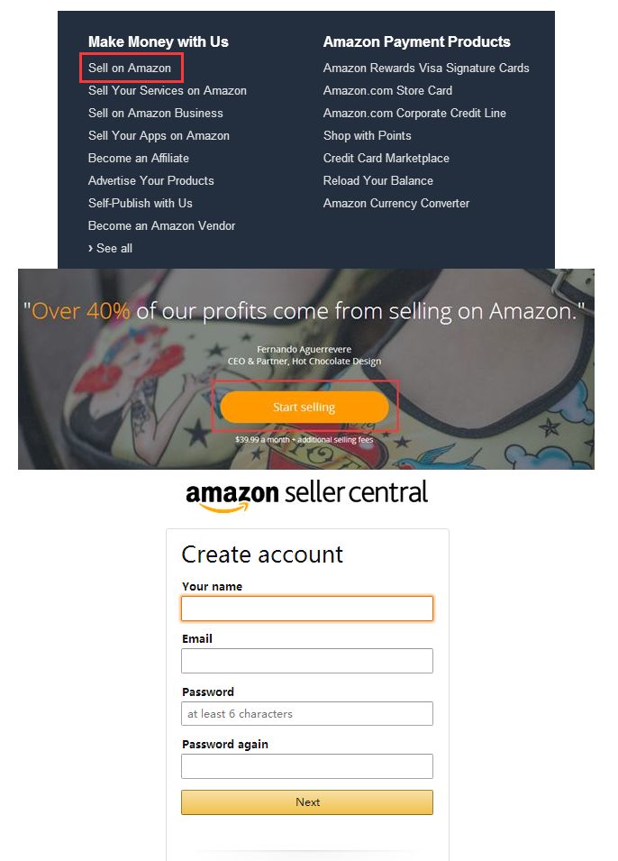 第一步:首先,进入 www.amazon.com 拉到页面底部:点击“Sell On Amazon”—“Start Selling”,然后开始创建帐户。