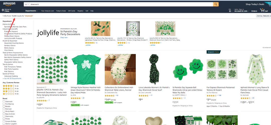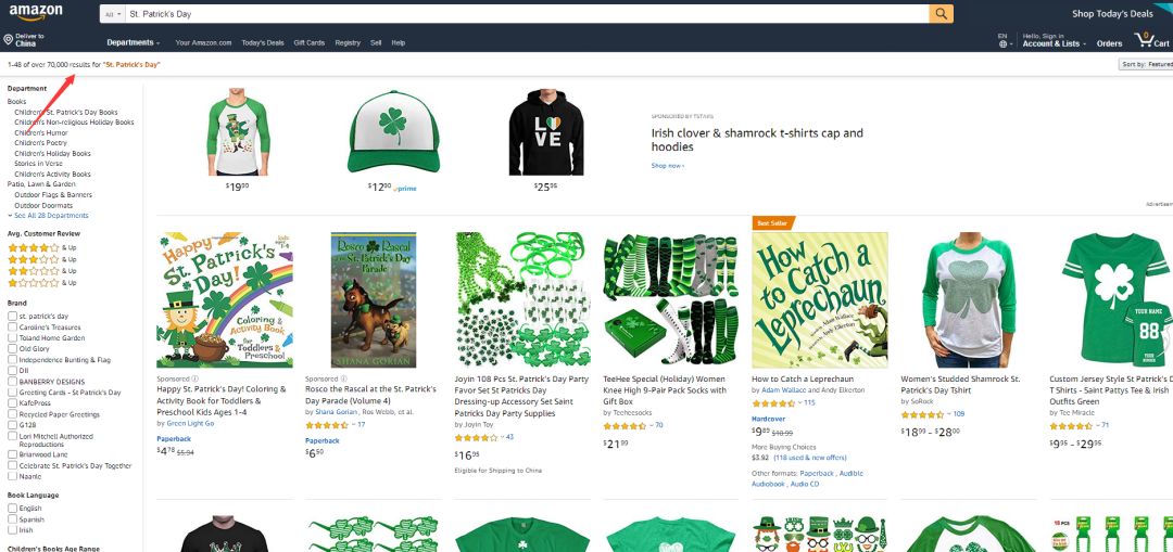 亚马逊美国站输入:St. Patrick's Day,左上角红色箭头显示70000的搜索结果。