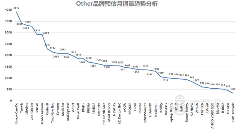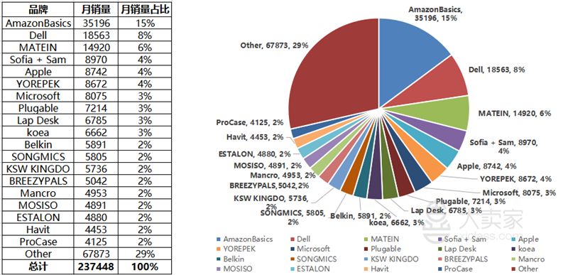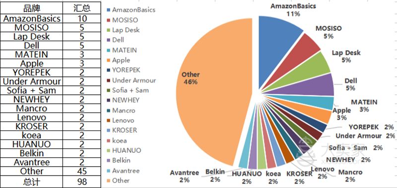 Laptop Accessories笔记本电脑配件品类月销量TOP5品牌共占比了36.4%,大多销量占比来自于产品——笔记本托架和箱包类。可见这两产品分类的占比更突出一些(具体产品分类占比下文会做单独分析),从数据来看也足以表明笔记本托架、箱包类的竞争市场是非常大的,突出了这两类的市场购买力和品牌影响力,但单从销量前5名品牌来看,该类目暂不存在品牌垄断性质。