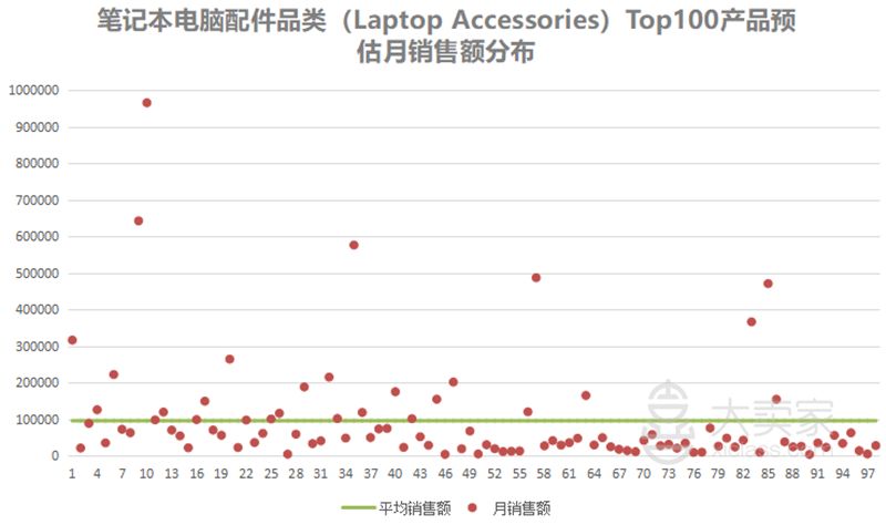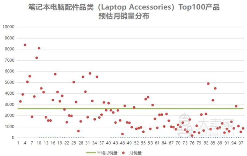 笔记本配件品类(Laptop Accessories)Top100产品预估月总销量237448件,日销7915件,产品平均月销量2423件,平均日销量81件。