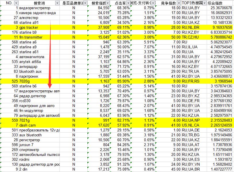 对算出的综合指数进行将序排序,排名靠前的这些商品关键词的品类是我们要找的产品,这些产品相对来说更具市场优势。