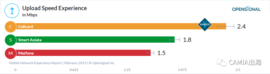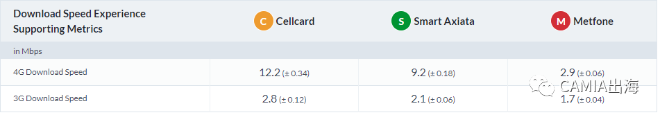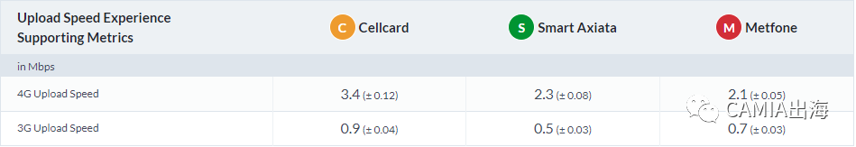 在整体上传速度方面,Cellcard的表现最佳,下载速度达2.4Mbps。其次为Smart Axiata,下载速度达1.8Mbps。排在最后的Metfone下载速度为1.5Mbps。