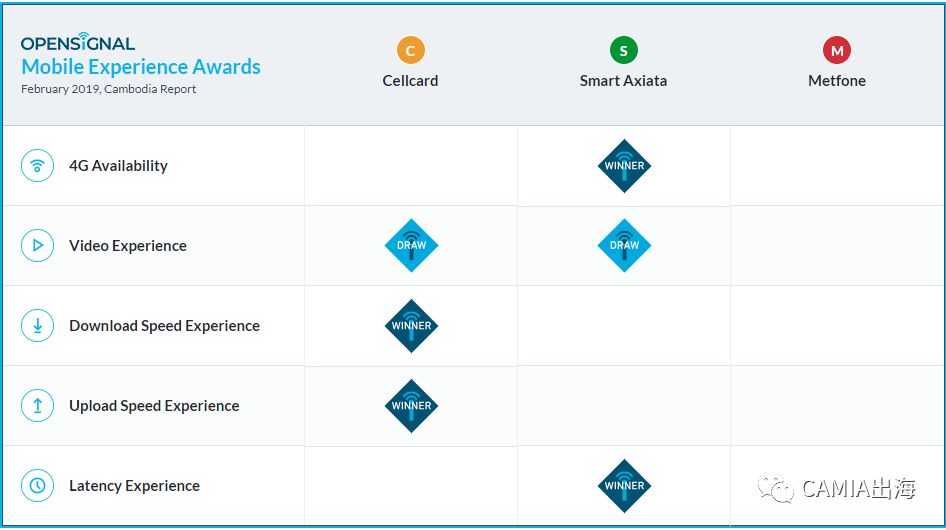 老挝主要有Smart Axiata、Cellcard和 Metfone三大移动运营商。根据opensignal调查结果,在4G可用性方面,Smart Axiata领先于其他两大玩家。而在视频体验方面,Smart Axiata与Cellcard的质量较佳于Metfone。此外,除了视频体验方面,Cellcard在下载速度和上传速度方面都优于其他两位玩家。