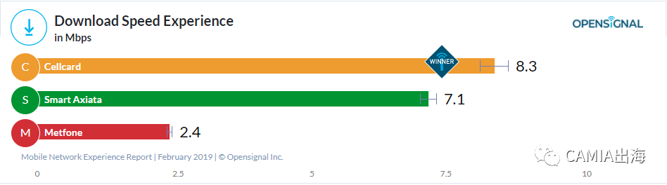 在整体下载速度方面,Smart Axiata和Cellcard的速度都相对较高,两者下载速度分别达7.1Mpbs和8.3Mpbs。而Metfone在这一方面的质量相对较低,速度仅达2.4Mpbs。其中Smart Axiata的下载速度有所变动,由2018年的8.4 Mbps降至今年的7.1 Mbps。