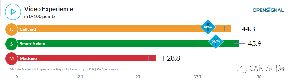 在视频体验方面,在以100分为最高评分标准下,得分较高的为Smart Axiata和Cellcard,两者分别得分45.9和44.3。opensignal表示这两个分数都相对非常低,这也就意味着视频在播放过程中会遇到很长的加载时间和频繁的中断。