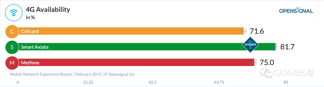 从整体上来看,柬埔寨三大移动运营商的4G网络可用性都有了很大的提升,其中Smart Axiata的变化最大。具体表现为,Smart Axiata增长了81.7%,Metfone增长了75%,Cellcard增长了71.6%。