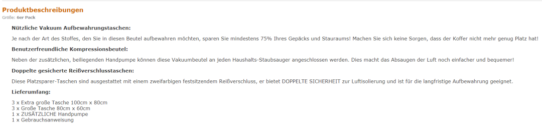 - 产品包含:3 个100x 80cm + 3个80x 60cm,旅行手动泵和使用说明。用于存放衣服,枕头,床罩,床单,毛巾,毯子等,节省高达75%的空间。