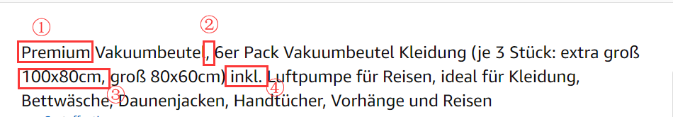 ② 在标题里少用甚至不用逗号,句号和其他特殊等。因为会有一定阻隔关键词整体匹配的作用。亚马逊对于关键词的抓取是整体性的,也就是说,只要顾客的搜索词包含在listing中,就都能匹配上(所以也不建议在标题中写重复词)。区别在于,整体词组和转化率高的词组会更优先显示。而标题是首要搜索阶梯,即使你不把词组写在一起,它也能被匹配上。当然,也有例外。如果品牌效应非常好,或词组非常精确且转化率非常好,那可忽视这些规则。