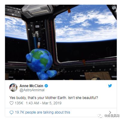 在SpaceX载人龙飞船Demo-1太空舱成功与国际空间站对接后,周日进入太空舱的McClain与地球玩具合影。然后,她把它带到国际空间站上,让它欣赏“地球母亲”的美景。“是的,伙计,那是你的地球母亲。她漂亮吗?”McClain发推文称。