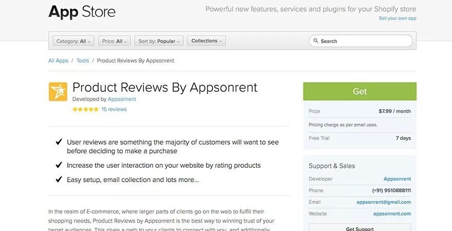 Appsonrent的产品评论是一款简化在线评论的应用程序 。你可以用它轻松地查看所有的评论,还可以回复客户的评论。