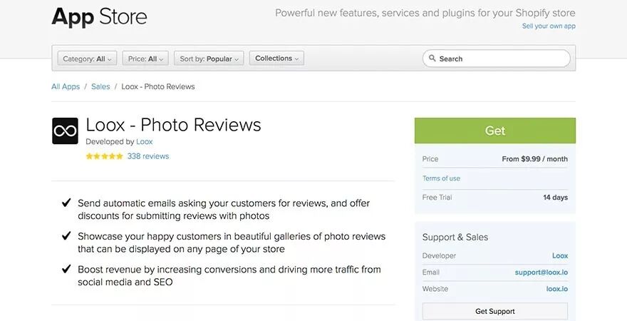 Loox的“照片评论”是一个客户可以用照片进行评论的应用程序。带有客户照片的评论有助于增加转化率,这个功能让Loox成为一个很好的社交证明应用程序。电子邮件发送出去后,评论在一个自动化的过程中获得。你可以随意定制应用程序的配色方案、电子邮件定时发送等。你可以对评论进行适当调整,选择性的发布内容。它甚至有rich snippets(富摘要信息)功能,帮您在搜索结果中排名靠前。