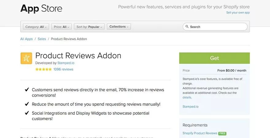 是Shopify产品评论应用程序的一个扩展。客户可以在电子邮件中直接写下他们的评论,这对他们来说很方便。你也可以很容易地追踪哪些客户收到了写评论的电子邮件。你可以在Facebook和Twitter上发布好评,展示客户喜欢你的品牌的原因。它甚至还有一个智能功能—检查客户的评论是否与星级相符。当客户留下1或2星级的评论时,他们被带到一个道歉页面,你可以在这个页面添加折扣代码,赢得第二次销售的机会。