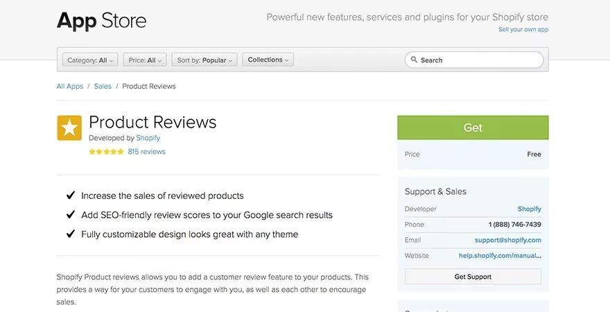 Shopify的Product Reviews是一款产品评论应用程序,它能让你在同一个地方快速地看到所有的评论。搜索评论也优化了,顾客以通过星级排名和在google上的排名筛选评论。这个应用程序和店铺主题的字体和设计要相匹配,确保外观一致。
