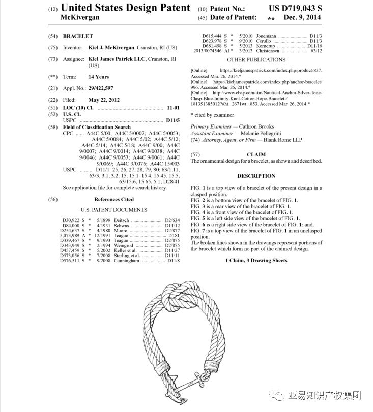 虽然Keith A. Vogt以图形商标侵权为由提起诉讼,但船锚手链,权利人KJP也是申请了美国外观专利的。如下图示,KJP在2014年12月获得了授权,保护期限14年。