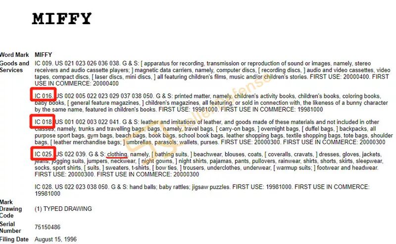 Miffy 品牌注册了包含016(办公用品)、018(皮革皮具)、025(服装鞋帽)、028(健身器材)等大类。