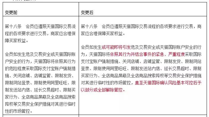 变更后的内容为“会员如发生或可能即将引发危及交易安全或天猫国际账户安全的行为,天猫国际将依照其行为并结合事件的紧急、严重程度采取国际支付宝账户强制措施、关闭店铺、店铺监管、限制发货、限制网站登录、限制使用阿里旺旺、限制发送站内信、延长交易超时、限制买家行为、全店商品屏蔽及全店商品搜索降权等交易安全保护措施对其进行临时性的市场管控,直至天猫国际确认风险基本可控后予以部分或全部解除管控。”
