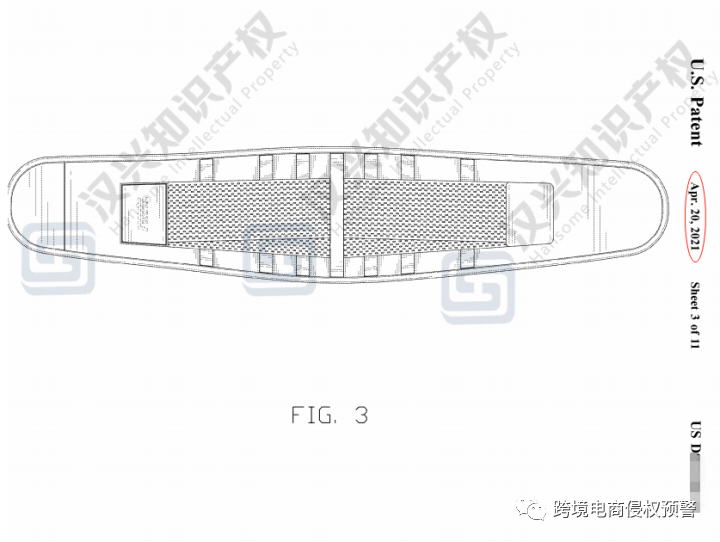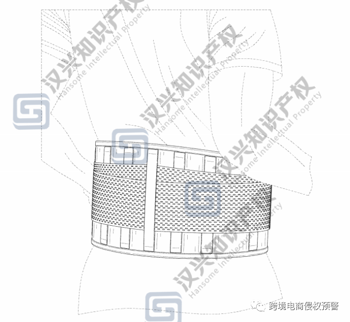 经美国专利背景检索,我们发现该产品在美国存在一款在先的高度相关的外观专利,这个月20号刚授权,权利人为一家深圳公司。下面就是这款护腰带在美国的外观专利截图: