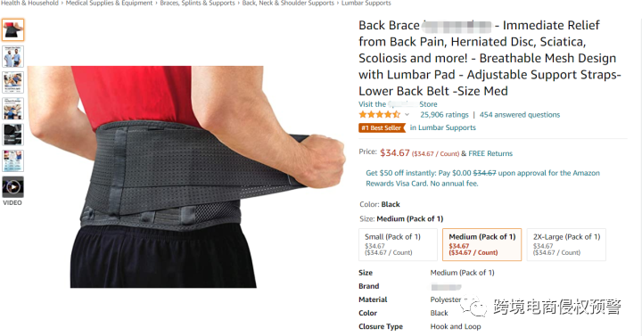 P.S.在亚马逊美国站发现目前有多家商家在售与这款外观差不多的护腰带,可能是因为该外观专利还是刚刚授权,权利人还没发起侵权投诉,后续可能就会挨个点名了。所以有在美国站销售相关产品的卖家看到这篇文章后要注意专利侵权问题了。