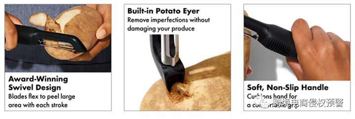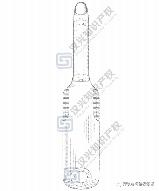 经欧美专利背景定向检索,我们发现该产品在美国跟欧盟都是有外观专利的(欧盟外观专利在2021年之前下证的在英国仍然有效),所以有在欧美站点销售相关产品的卖家,都有可能被投诉。下面就是这款削皮器在美国欧盟的外观专利截图(欧盟外观专利可以线条图申请也可以直接产品图片申请):