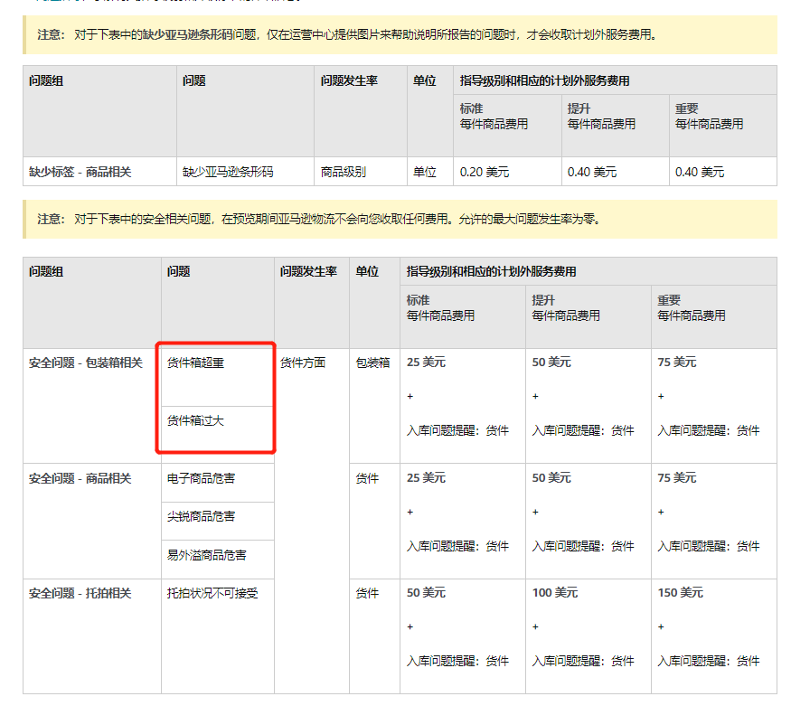 关于计划外服务费的规定,可以看到货件箱超重和货件箱过大,都会被收取25-75美金不等的计划外服务费。
