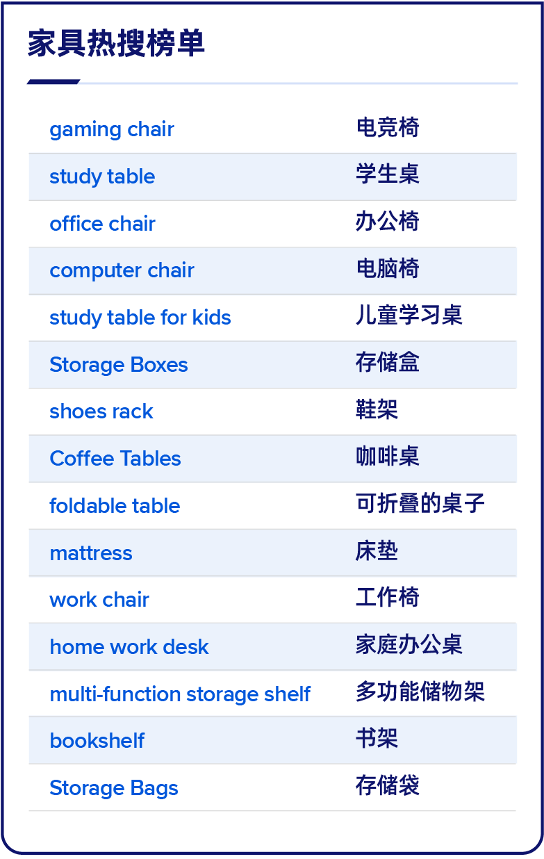 最后,小编为各位商家整理了一份近期家具热搜词榜单,商家可根据不同商品特性进行关键词调整。以上便是本期家具情报局的全部内容,如果你有更多想了解的内容以及想对我们说的欢迎在下方评论区以及公众号留言。