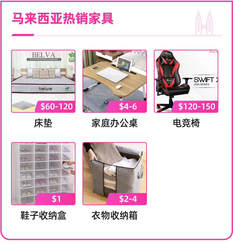 马来西亚的城市化影响着当地居民对家具和生活用品的需求。越来越多的人现在住在空间更小的公寓里。因此,在选择家具用品的时候,节约空间更成为一个优先考虑的问题。鞋子、衣物收纳盒等各式收纳盒、折叠桌在马来西亚持续热销。高性价比的床垫也马来市场高潜商品。
