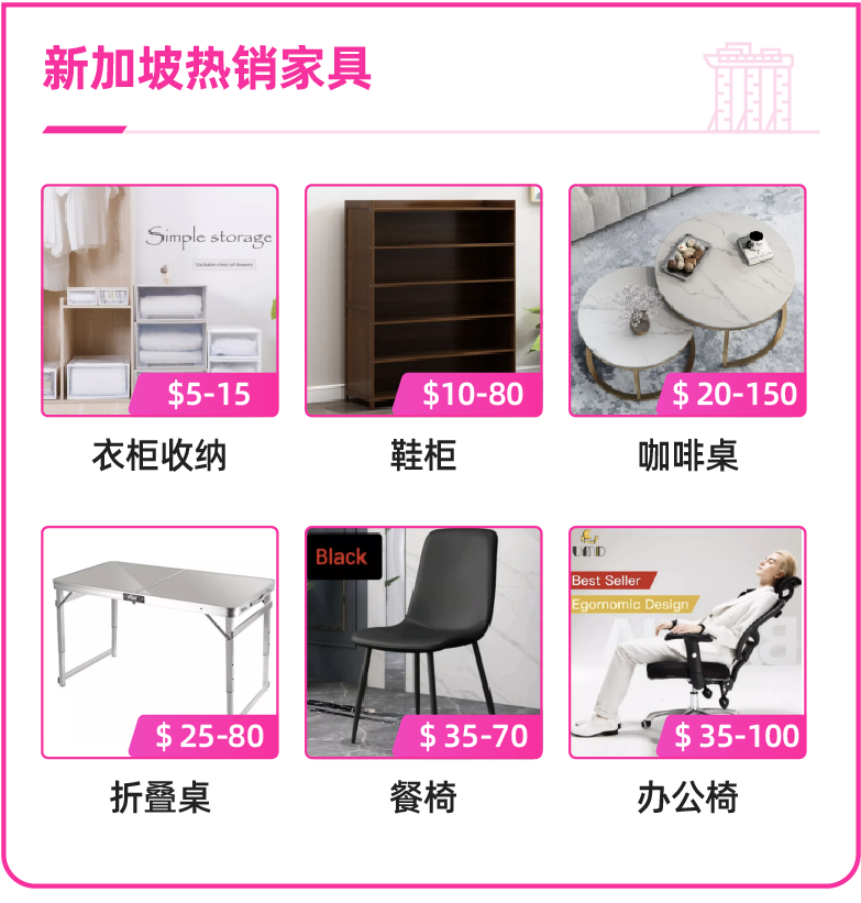 大部分新加坡人的网购习惯是追求精致化的生活,对于家具的选购也同样不例外。咖啡桌成为近期新加坡家具市场的热搜词。精致的矮桌不仅满足日常生活的装饰和生活用途,小巧的外形更是节省空间的好物。同样具有节省空间属性的折叠桌,鞋柜等家具在新加坡十分热销。