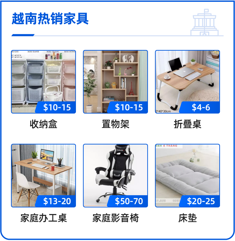 有同样收纳需求还有越南的买家,疫情期间消费者因为无法出门,养成了大量囤积工具和生活用品的习惯,越南买家对家居收纳用品的需求量不断增加,间接推动了收纳盒、置物架等各式收纳型家具在越南市场的热卖。