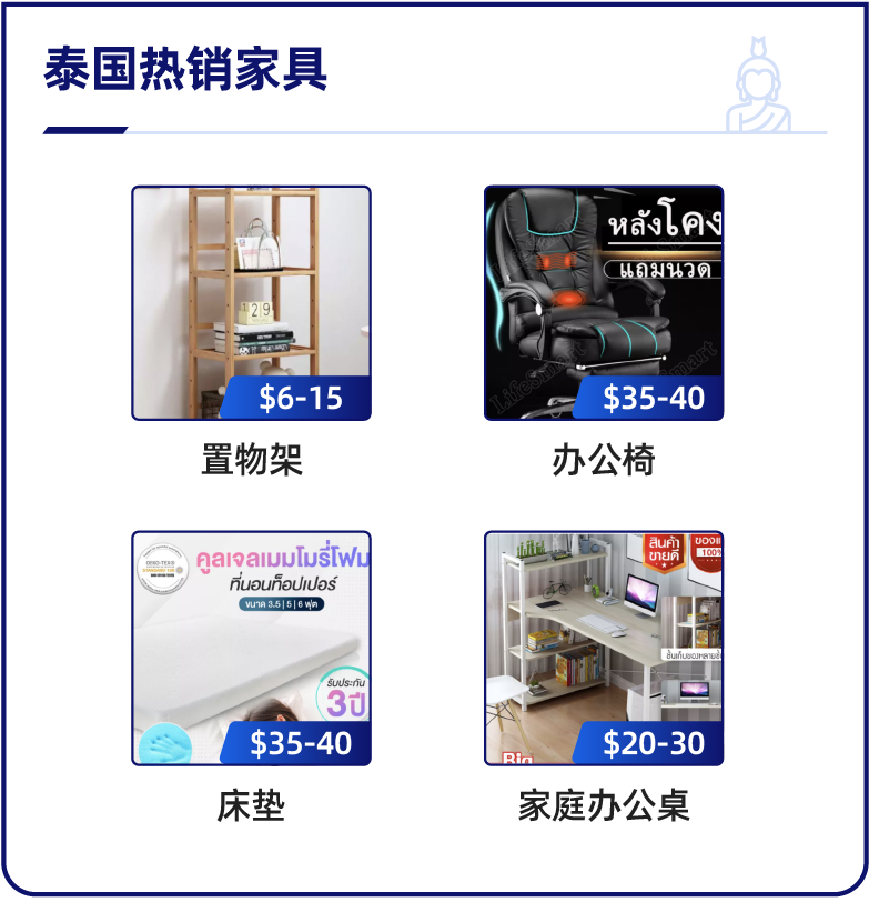 除了全球热门的办公家具外,泰国市场近期对床垫和置物架的需求也逐步攀升。在选购床垫时,除了商品本身的睡感之外,运输体验也是泰国买家在意的细节。高效的物流、完好美观的包装、轻便的商品是出现在评论区最多的褒奖词,商家在备货时需要更关注这些细节,一次提升买家购买体验。