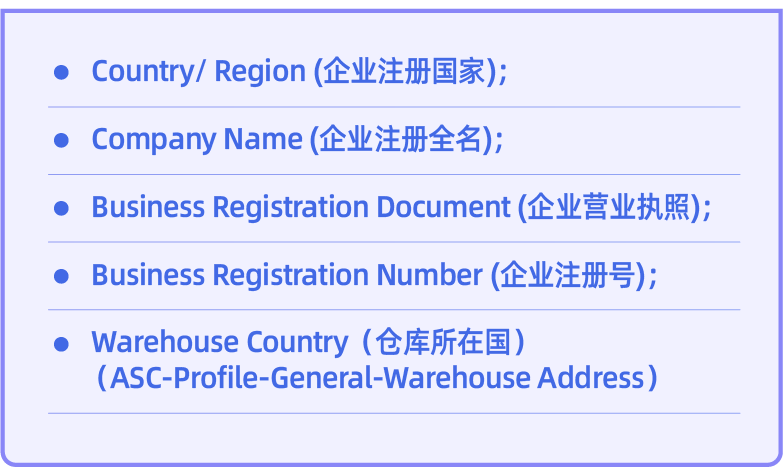 请您同时也到MY店铺的ASC-Profile-General-Business Information查看并正确更新以下企业信息: