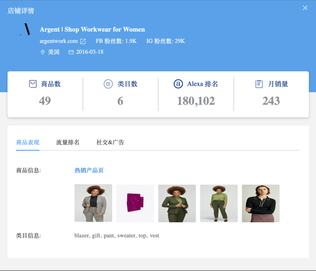 Argent 是 2016 年成立的一个针对职场女性的职业服装品牌,Q3 的网站流量较上一季度增长了 141.7%,但月平均访问量还不大,只有 4w。Argent 最新一次融资是在 2019 年 2 月,获得了 400 万美元的战略投资。