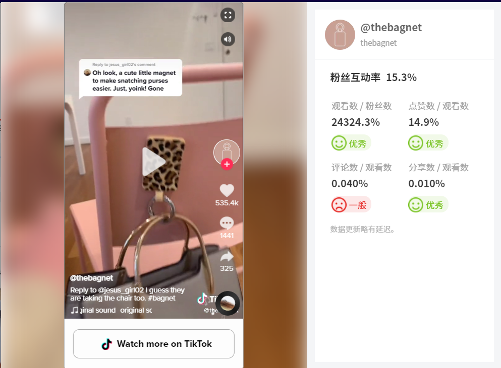 其实,通过评论分析和用户调研,会不难发现用户关于产品的共性疑问,比如这么一款仅仅依靠2块磁铁吸附的小巧商品,能否承受的住自己包包的重量。进而11月3日,卖家上传了一条展示磁力包钩承重能力的视频,视频表现数据有了质的飞跃,不仅观看量达到190万,粉丝互动率也达到了15.3%。