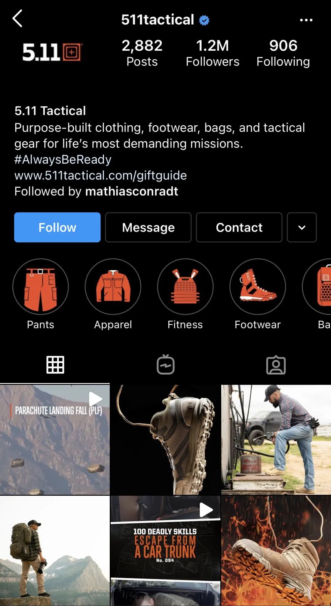 重视社交媒体,积累私域流量,拥有忠诚的粉丝群体,也是5.11 Tactical成功的要素。5.11 Tactical在Instagram上做了账号矩阵,主账号粉丝有120万,主要为独立站进行导流。