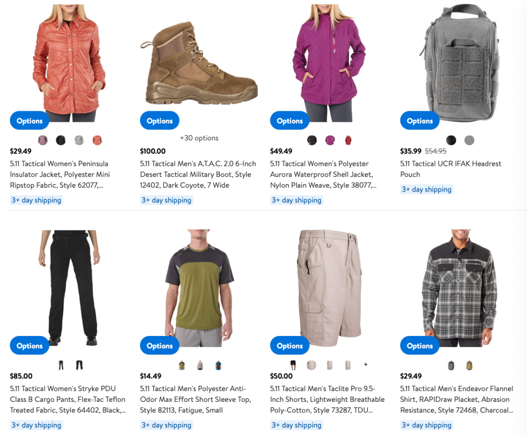 在其他主流平台,如沃尔玛,以及线下零售渠道,5.11都实现了全平台分销。截至2020年9月,5.11 Tactical在美国27个州经营着82家连锁零售店。