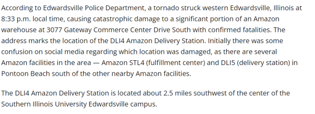 Cardinal news于12月11日11:20报道,伊利诺伊州爱德华兹维尔的DLI4亚马逊送货站确认有两人死亡。