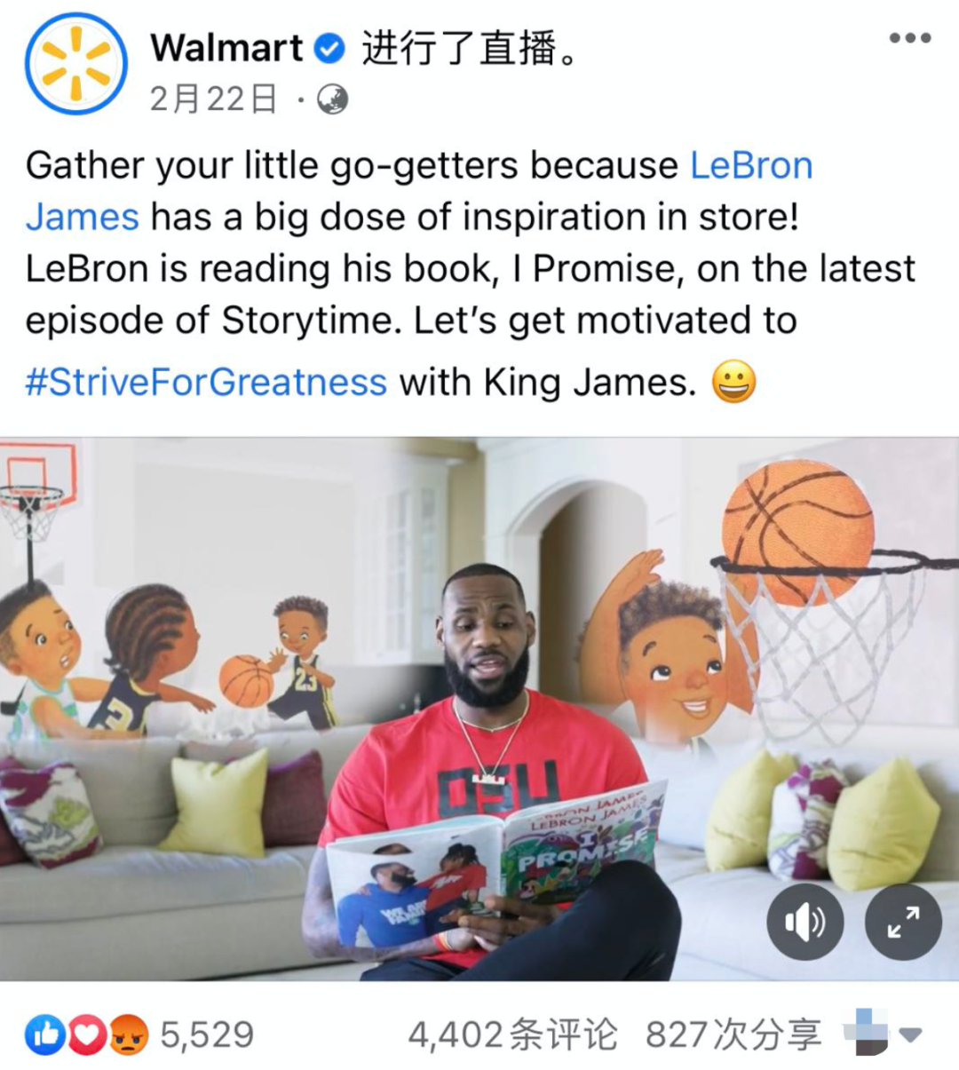 今年2月,沃尔玛就在它近3300万粉丝的Facebook官方账号上联合NBA巨星勒布朗詹姆斯进行了一次新书朗读直播。