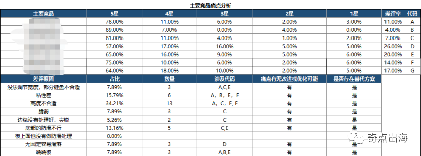 竞品的平均星级为4.6。这些差评中主要的差评为高度不合适、粘性差、防滑不行、补课调节宽度部分键盘不合适。其中最致命的一点为高度不合适,该产品本身就是为改变键盘高度而存在的,若并不能解决顾客的这个需求,基本就丧失了产品竞争性。