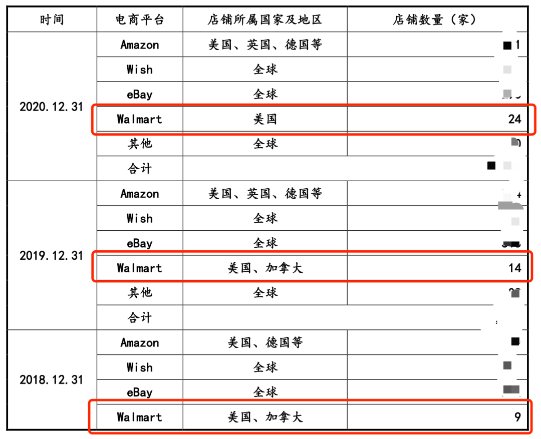 从店铺开设情况总数,过往三年,该大卖在沃尔玛平台的店铺数,分别为9家,14家,24家。