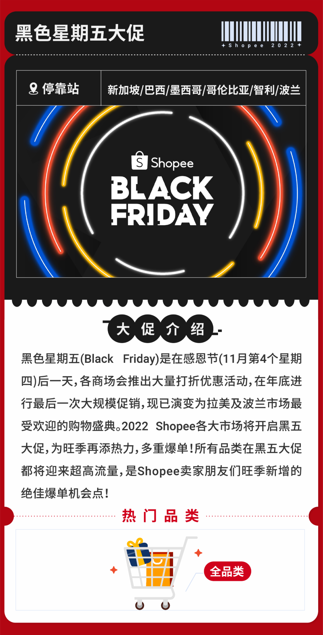 想把握好全年大促增长,卖家朋友们必先提前布局。Shopee 2022年除了有东南亚市场多个大促盛典,更是再添巴西、墨西哥、智利、哥伦比亚和波兰全新大促火力!盛大的狂欢节、倍具特色的Buen Fin、黑色星期五和圣诞大促,将成为跨境卖家掘金点。